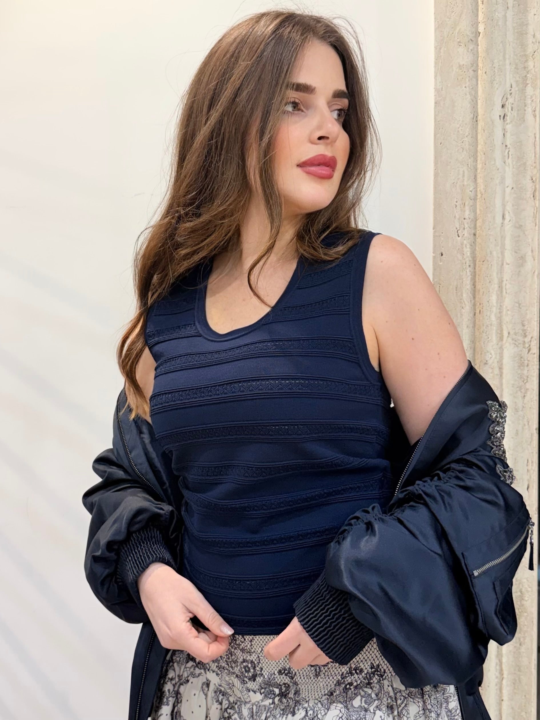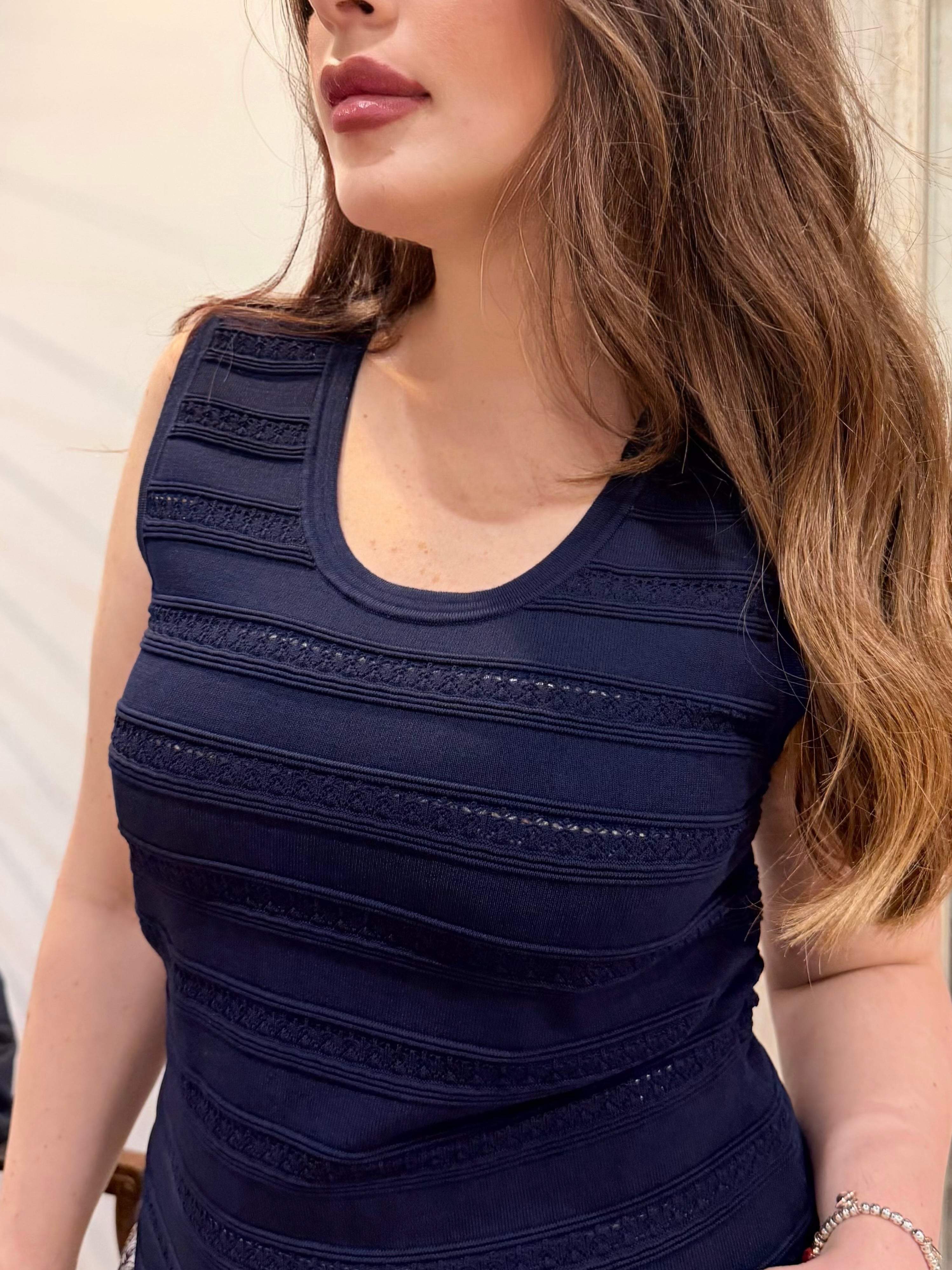 Top modello canotta firmato Blugirl, realizzato in maglia dalla lavorazione ricercata, caratterizzato da una raffinata texture a righe orizzontali con inserti traforati che creano un elegante gioco di trasparenze.