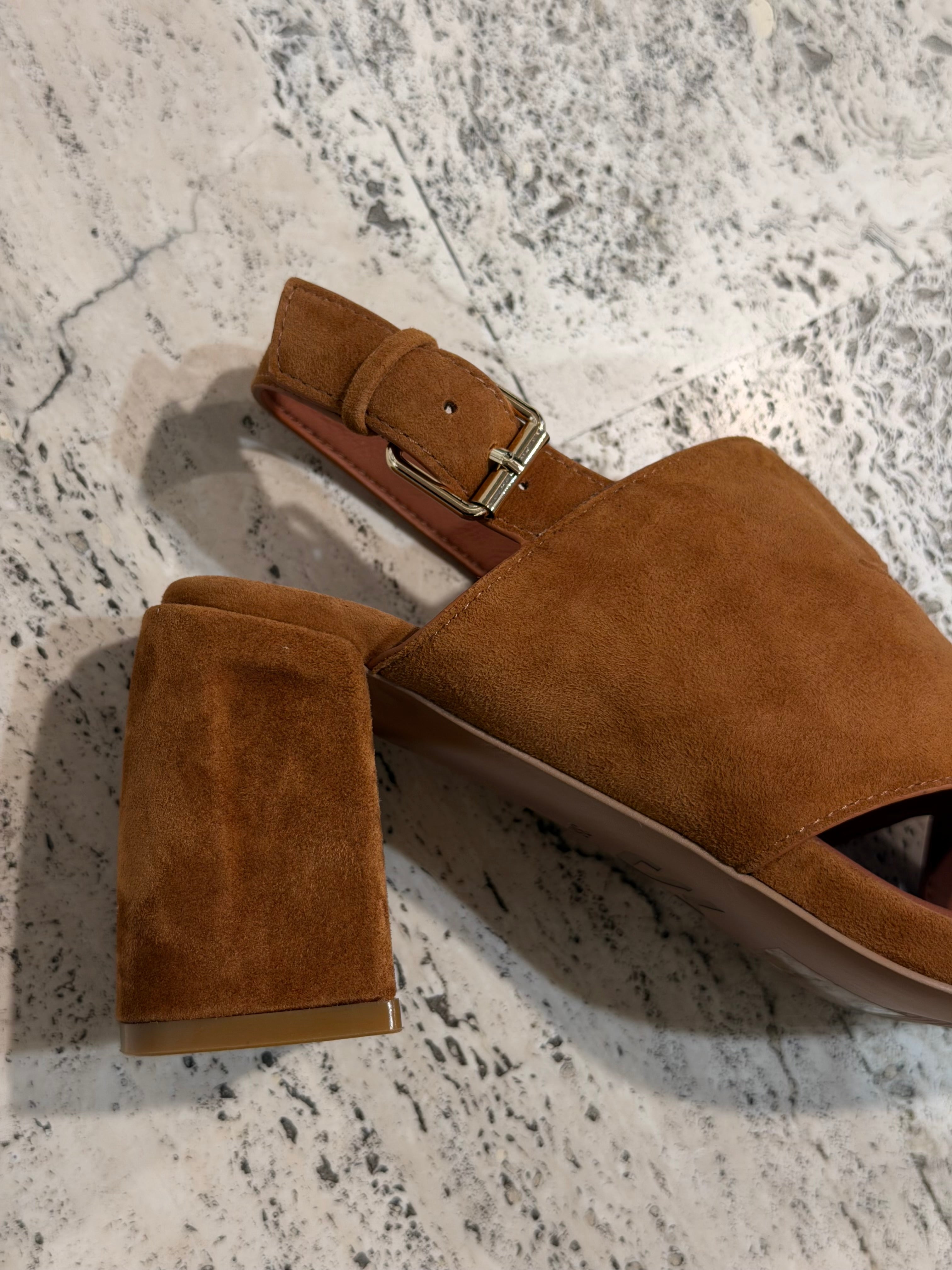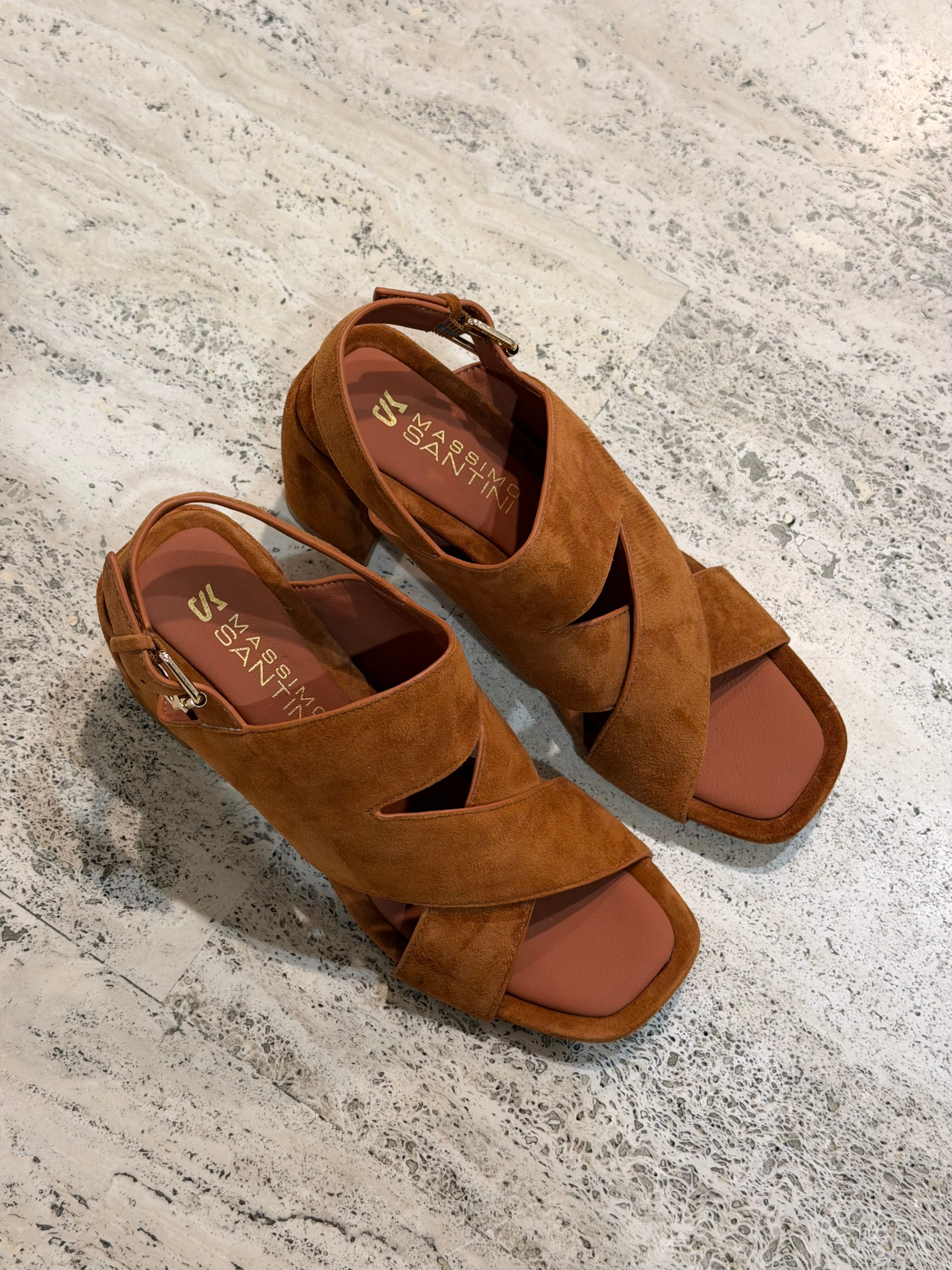 Sandalo in pelle scamosciata dalla tonalità calda, perfetta per accompagnare con naturalezza le sfumature della stagione primaverile. Il design a fasce incrociate avvolge delicatamente il piede, mentre la chiusura con fibbia alla caviglia assicura una calzata stabile e femminile.