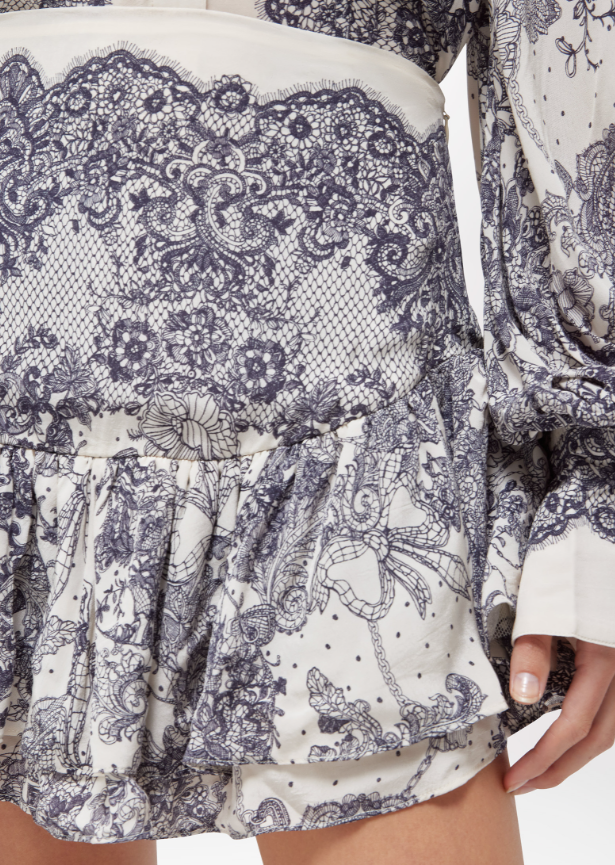 Shorts in viscosa firmati Blugirl, caratterizzati da una sofisticata stampa piazzata effetto pizzo che dona al capo un’allure grafica e ricercata.