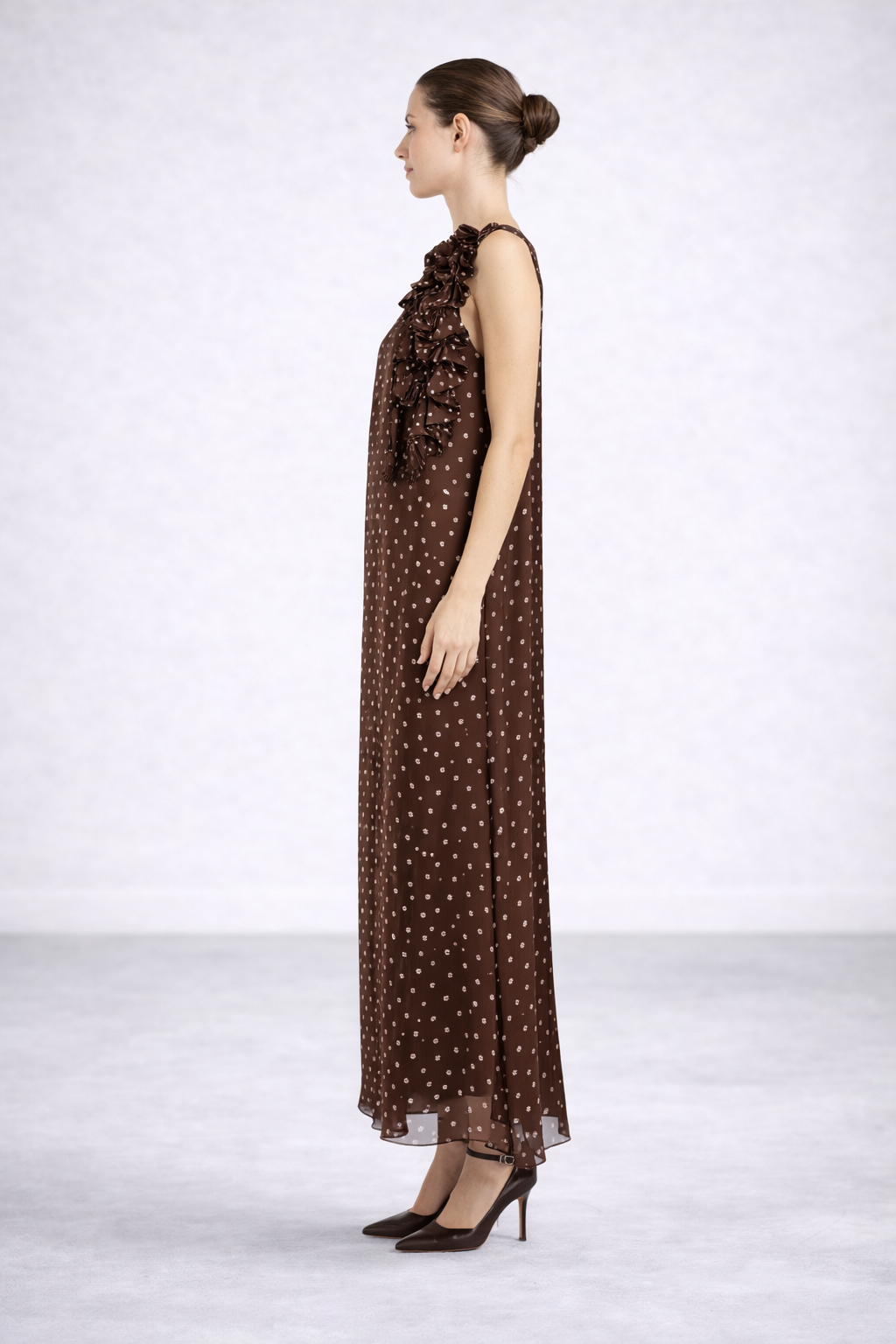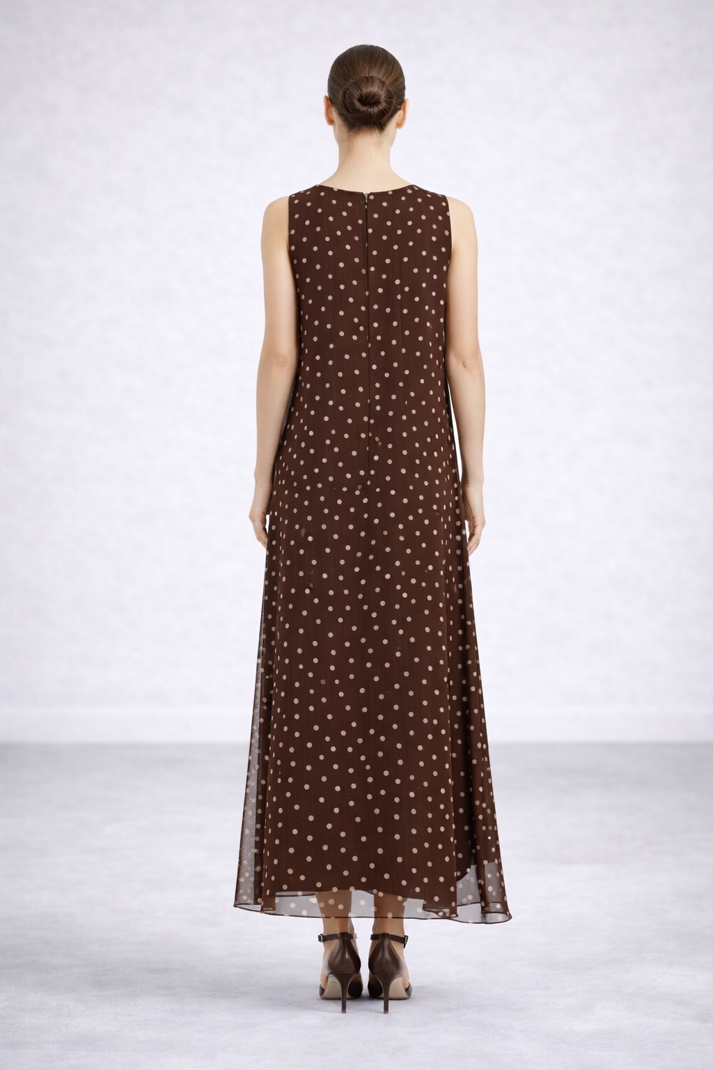 Abito lungo smanicato in chiffon color marrone con stampa a pois panna, dalla fantasia raffinata e delicata.