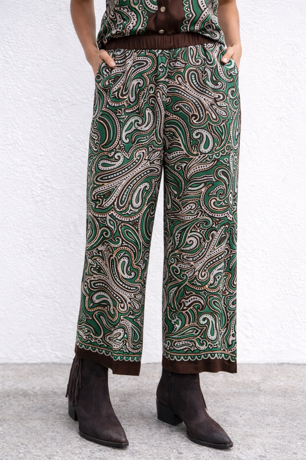 Pantalone in pura seta con fantasia paisley nei toni del verde, marrone e panna, caratterizzato da una texture fluida e luminosa che dona movimento e leggerezza alla silhouette.